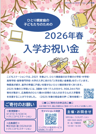 こどもステーションでは、2021年春より、ひとり親家庭のお子様の小学校・中学校・高等学校・高等専門学校・大学の入学に向けた「入学お祝い金事業」を行ってきました。